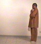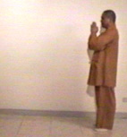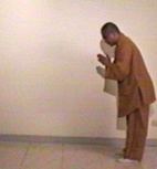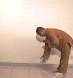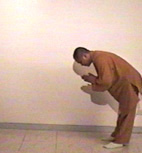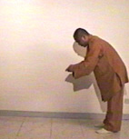 將右手掌放於左手平齊之處,並彎下腰,使臉與地面平行